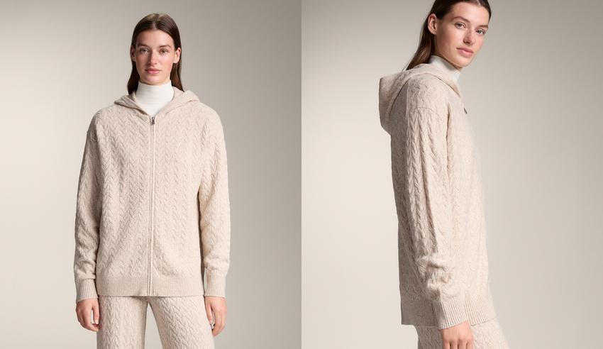 Long hooded cable knit jacket